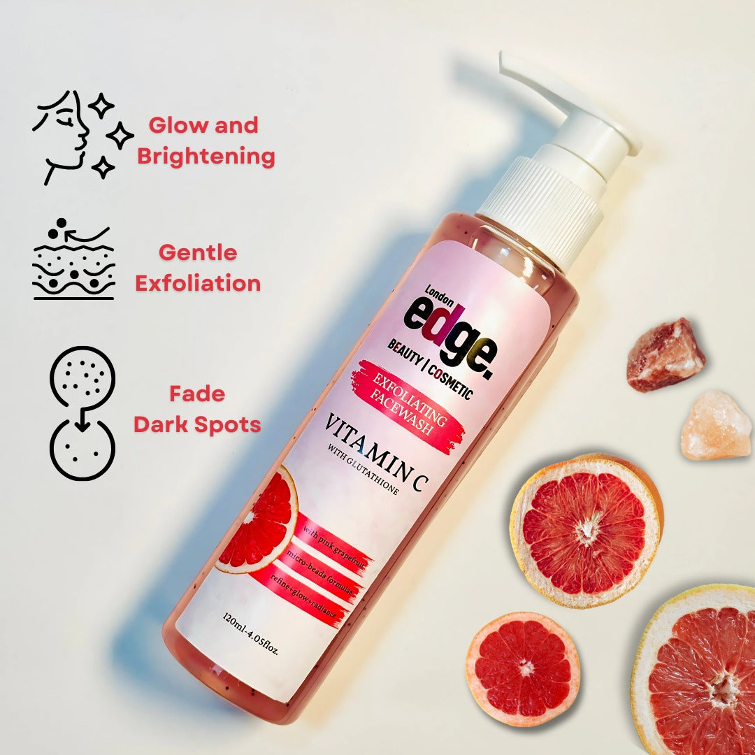 Edge Exfoliating Face Wash is powerful blend of Vitamin C, Glutathione and naturally sourced extract of Pink Grapefruit designed to cleanse, exfoliate, and brighten your complexion.